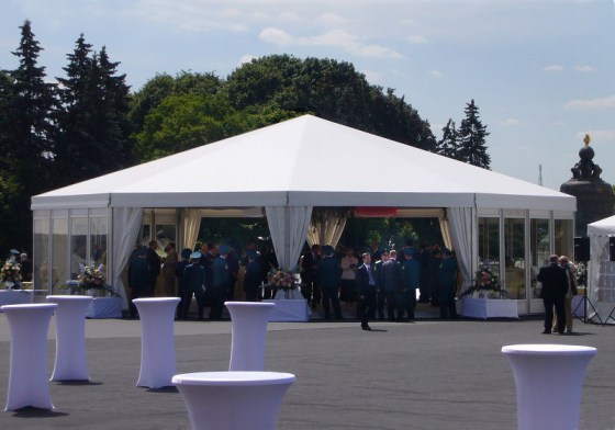 篷房分为两个部分,一部分支架,另一部分就是篷布。支架结构为高强度6061/T6的铝合金型材组成,造价比钢铝和钢材相对而言要贵得多。篷布是PVC双层刀刮布材料,比一般的折叠帐篷、帆布等普通帐篷抗污、防紫外线、阻燃等性能要更优越,使用寿命长达8-10年。