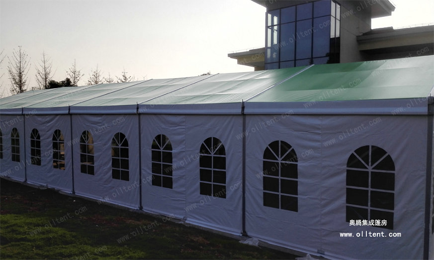 JX系列小型篷房常规宽度是6米、9米、12米、15米共四种常用尺寸。篷檐高度(边高)是3米。篷房的结构采用单元组合式设计,长度可按3米间距增加或减少。支架的主要构件(立柱和斜梁)用四槽的122×68×3㎜四槽的高强度氧化铝合金管材制造,篷布采用阻燃的双面PVC刀刮布,符合欧洲DIN4102B1、M2标准。克重650、750、850克/平方米,有遮光和半透光两种篷布选择,篷房同样可以配套ABS墙体、三明治墙体、彩钢瓦墙体、玻璃幕墙、排水槽等丰富的配置,满足各种功能需要。